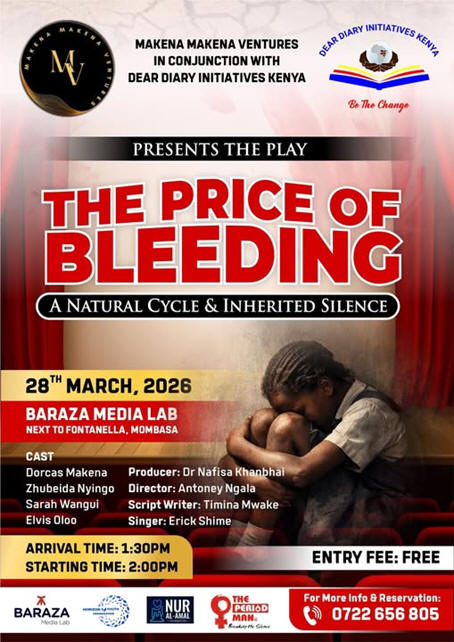 As we all celebrate women day today lets all remember all those women that are struggling to have one decent meal a day. Above all lets all remember those women that cant afford to buy pads during their menstrual days and use very cheap unhygienic ways to overcome the days of period. Dear Diary Initiatives Kenya presents THE PRICE OF BLEEDING a play based on women and the cultures and the beliefs of taboos. Venue: Baraza Lab (next to Optica opposite Vijay Optica.). Time Arrival 1.30pm to 2.30pm. Entrance: Free. We have a seating capacity of 80people. Kindly confirm your attendance on 0722656805.